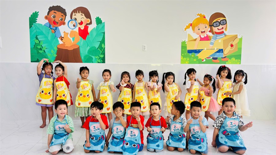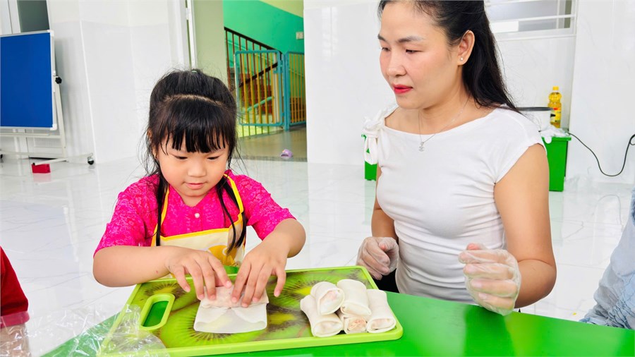 Hành trình trải nghiệm làm "Đầu bếp nhí" bắt đầu từ 7h30 sáng, không khí tại các lớp mẫu giáo đã trở nên náo nhiệt hơn bao giờ hết. Một điểm nhấn đặc biệt của chương trình năm nay chính là sự đồng hành của Quý Phụ huynh. Dưới sự hướng dẫn tận tình của ba mẹ và cô giáo, các bé đã có trải nghiệm thực tế cực kỳ thú vị khi tự tay cuốn những chiếc chả giò xinh xắn, chuẩn bị cá viên chiên, khoai tây lắc và những ly nước cam tươi mát.